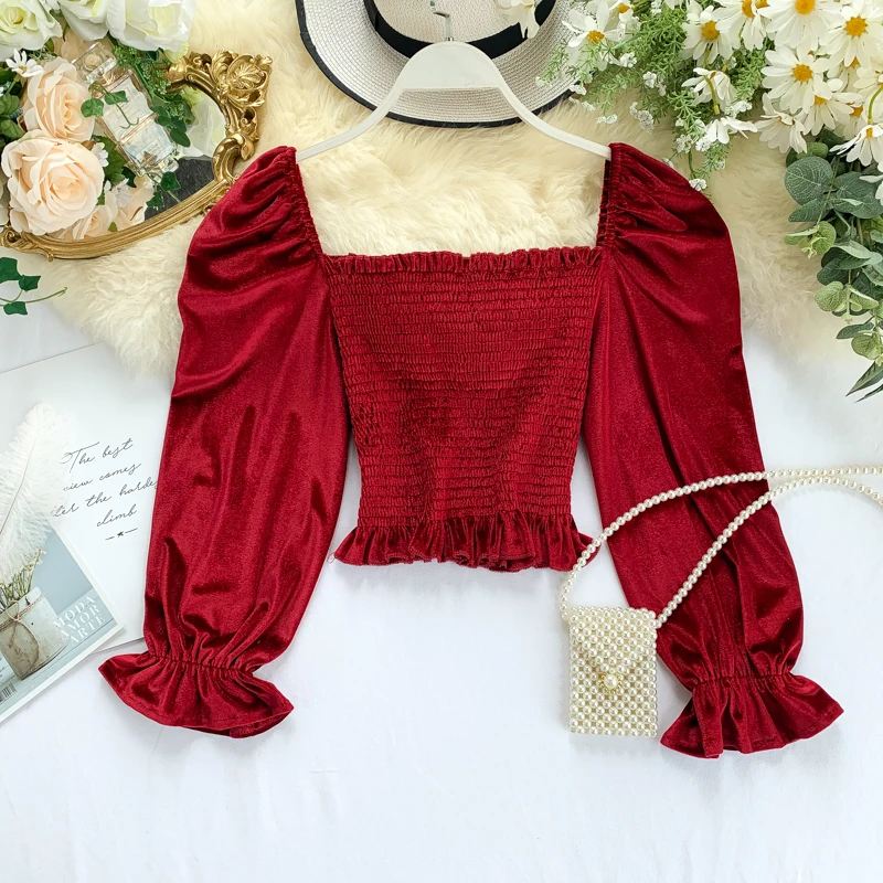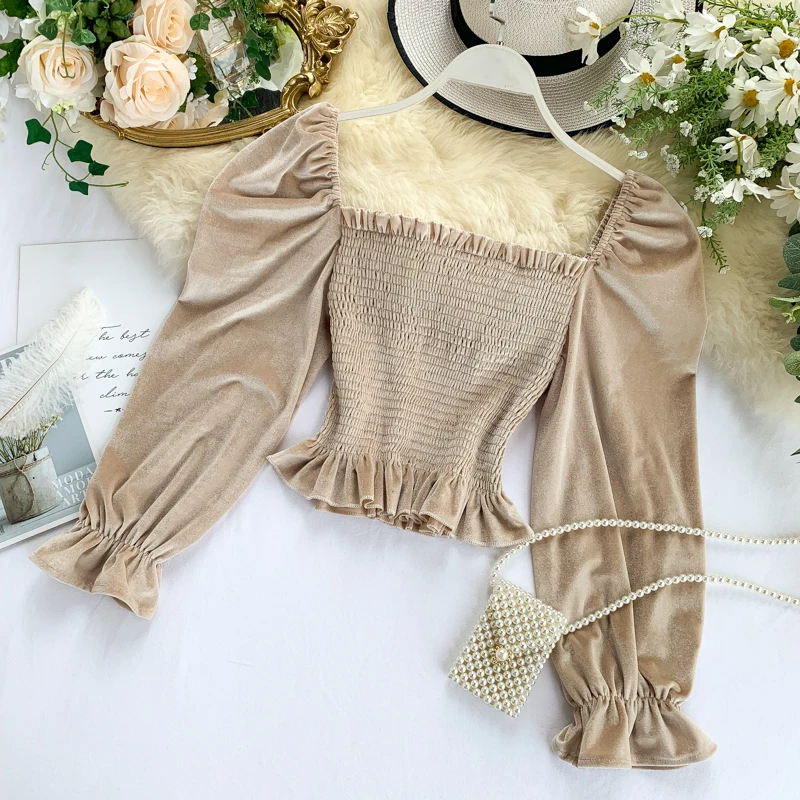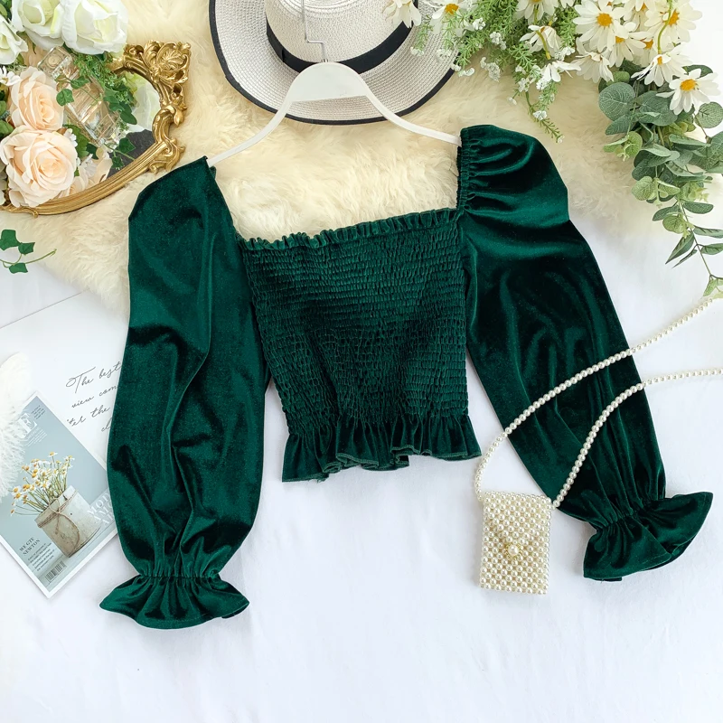 | 2019 Womens spring autumn slash neck Full sleeve vintage velvet shirt female casual high waist short tees tops G853 |