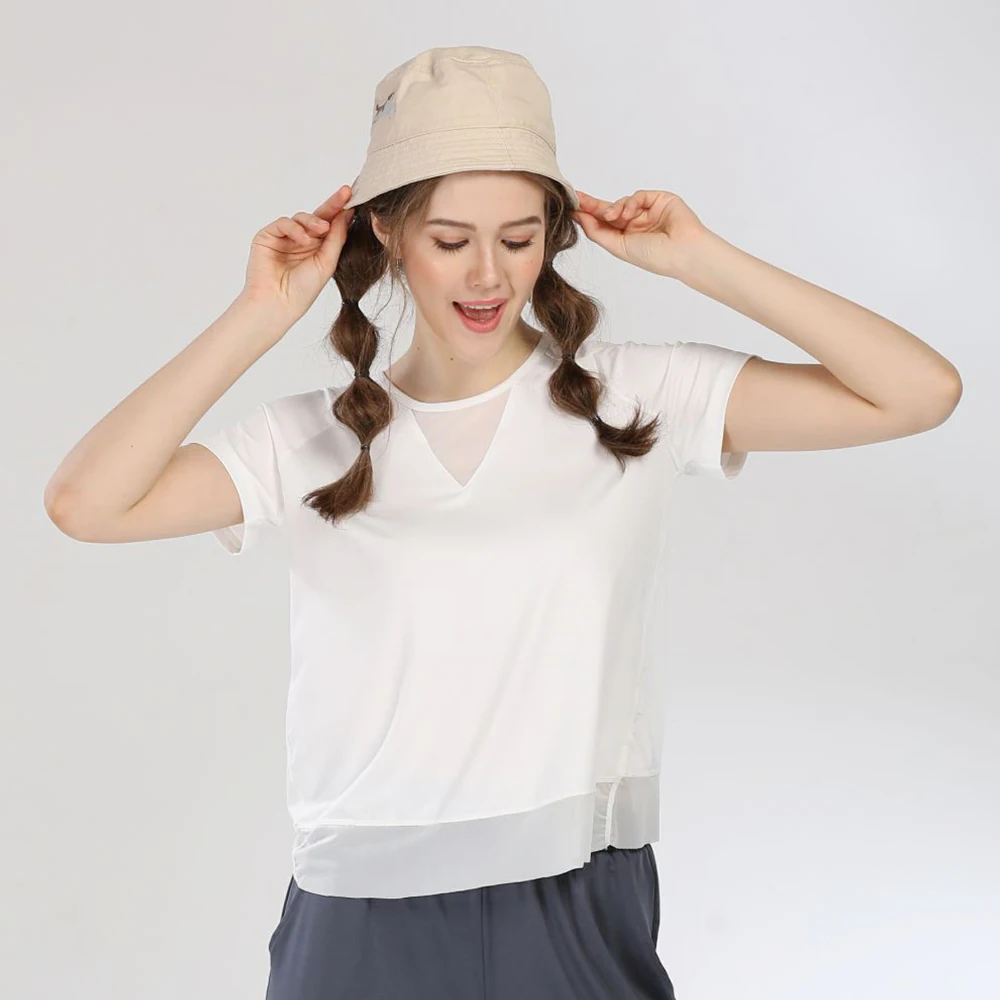 Women Shirt with Mesh Patchwork O-neck Casual Tops Fitness Sports Breathable Sexy Cross Back T-shirt Quick Dry Gym Wear Mujer