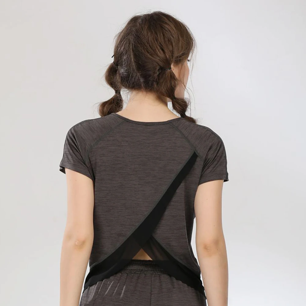 | Women Shirt with Mesh Patchwork O-neck Casual Tops Fitness Sports Breathable Sexy Cross Back T-shirt Quick Dry Gym Wear Mujer |