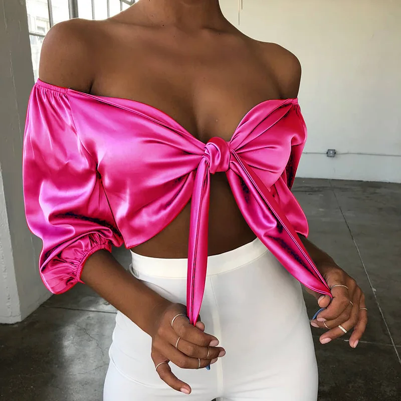 | Womens Bow Tie Off Shoulder Sexy Crop Top Feminine Half Sleeve Lace Up Bandage Cropped Shirt Slim Short Tank Top Tees |