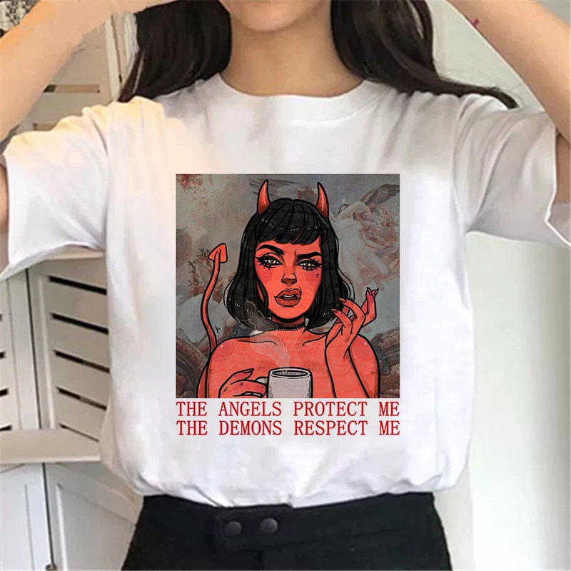 | THE ANGELS PROTECT ME THE DEMONS RESPECT ME Print T-shirt Chic Harajuku Vintage E Girl Short Sleeve Top Womens Fashion T-shirt |