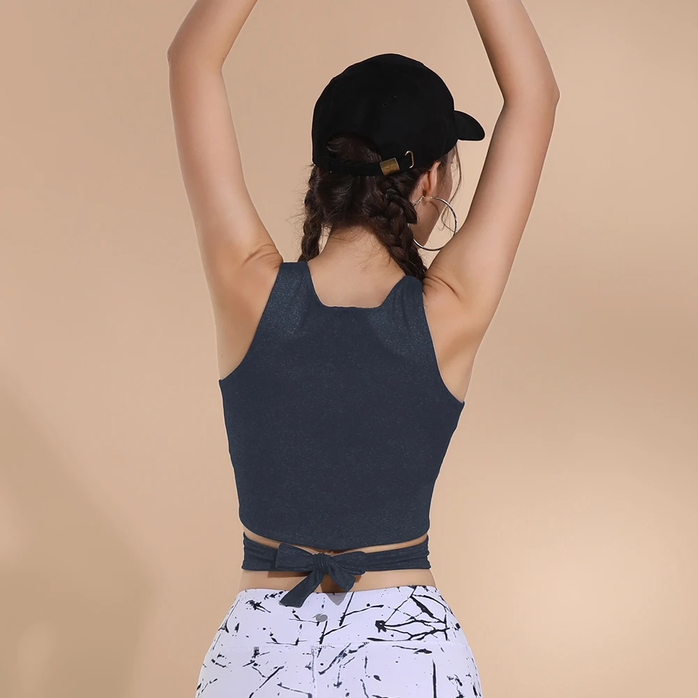 | Femme Padded Tank Top Sports Shakeproof Pull Up Vest Mujer Sexy Cross Hem with Bandage Hollow O-neck Crop Top Fitness |