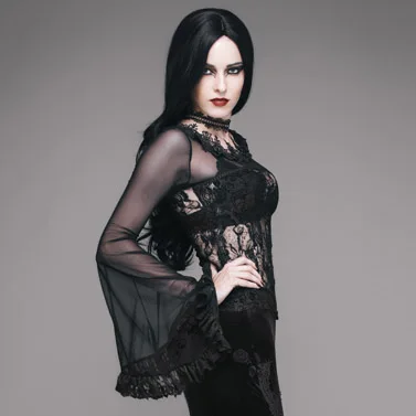 | Devil Fashion New Gothic Women Sexy Black Lace T-Shirts Long Flare Sleeve Hollow Out T-Shirt Floral Pattern Tees O-Neck Tops |