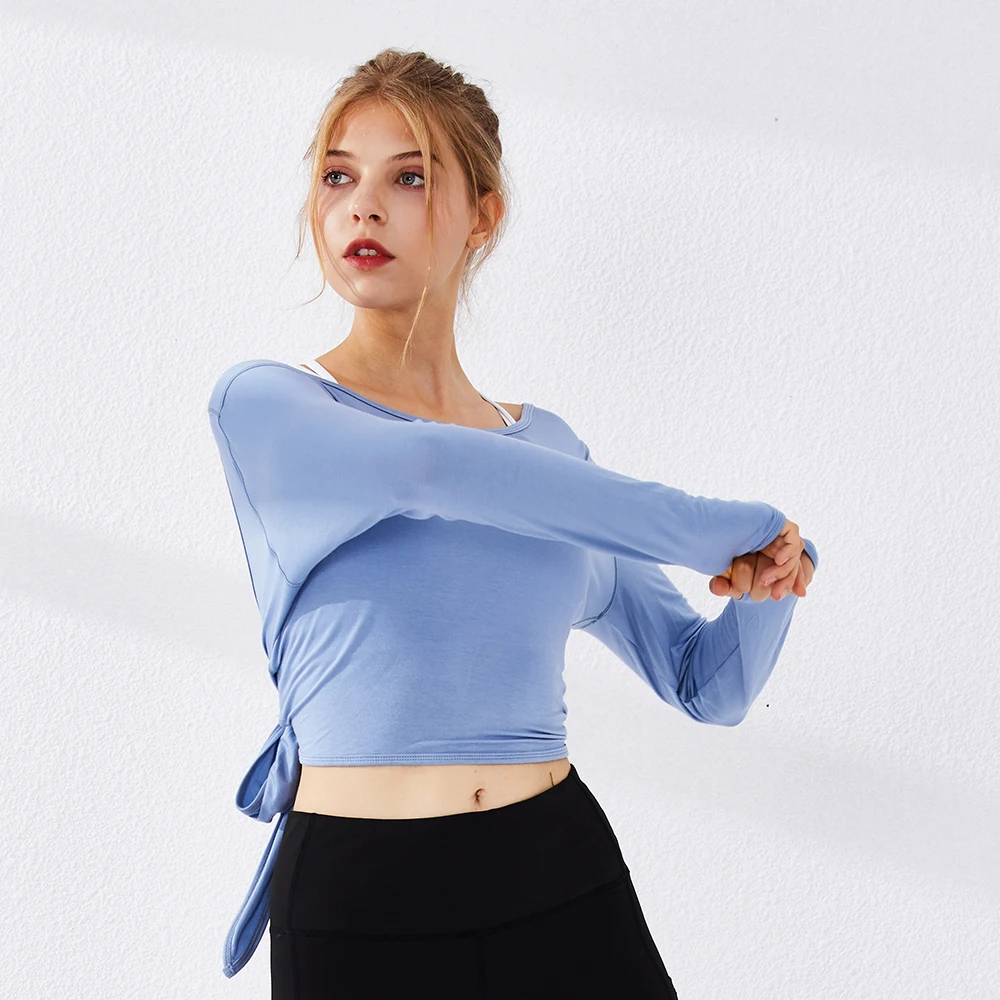 Women Sexy Tie Knot Long Sleeve Crop Tops Sports with Thumb Hole Both Front and Back To Wear Comfortable Pullovers for Workout