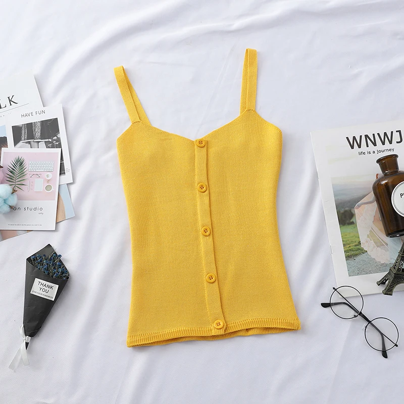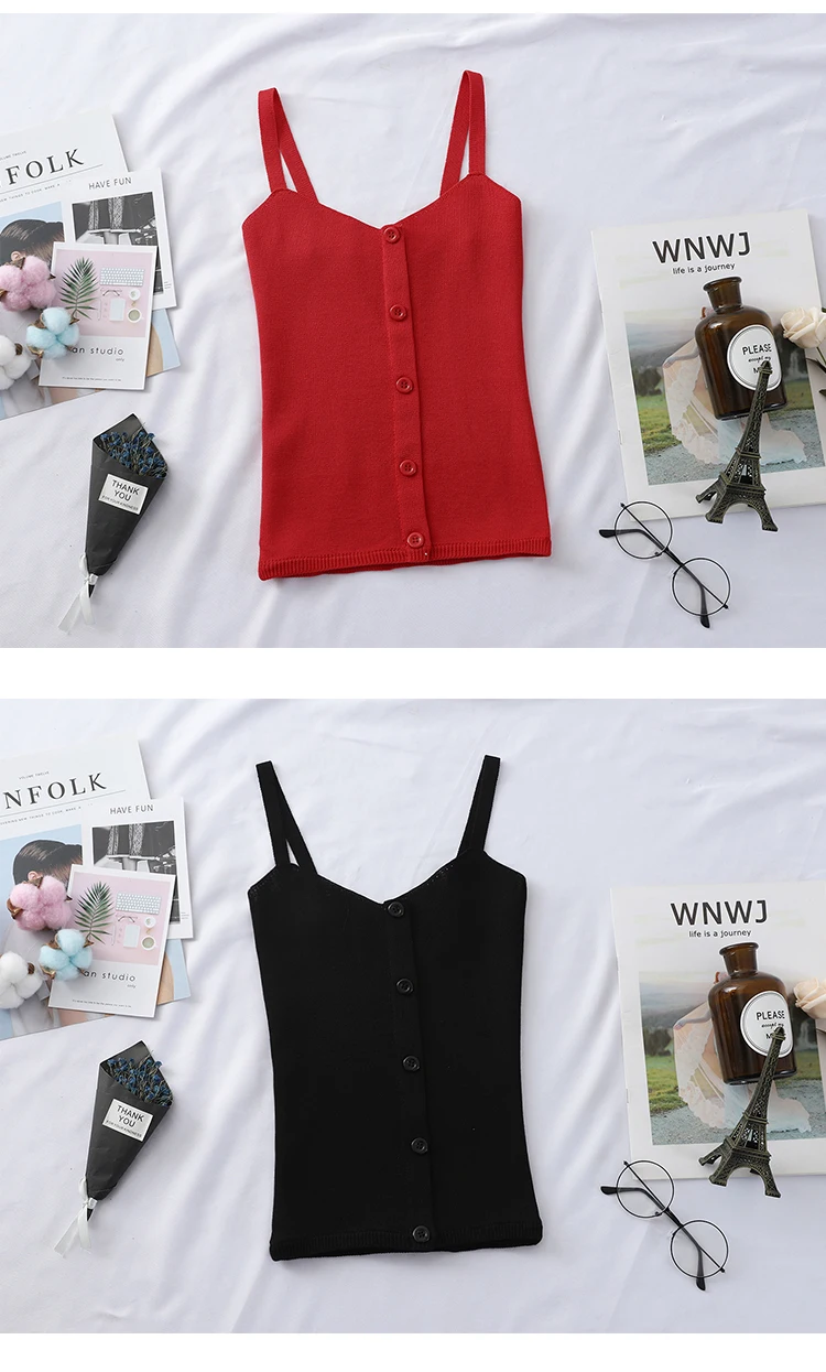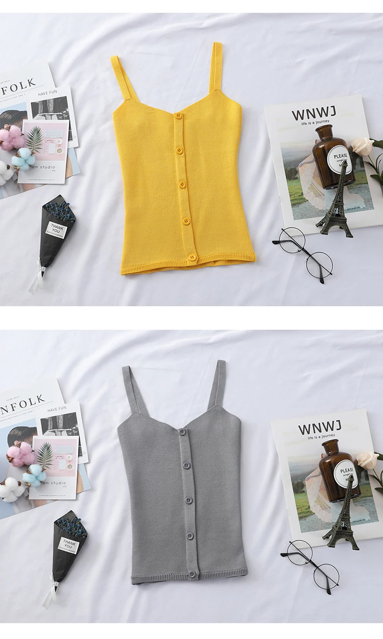 New Female Summer Sleeveless Knitting Inside Bottom Short Sexy Crop Top Club Solid Tank Tops With Buttons G523