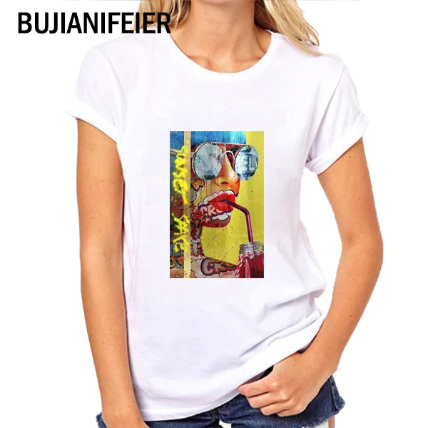 BUJIANIFEIER 2019 NEW fashion summer Short sleeve girl Slim fit print Girl holding coffee T-shirt BJN79