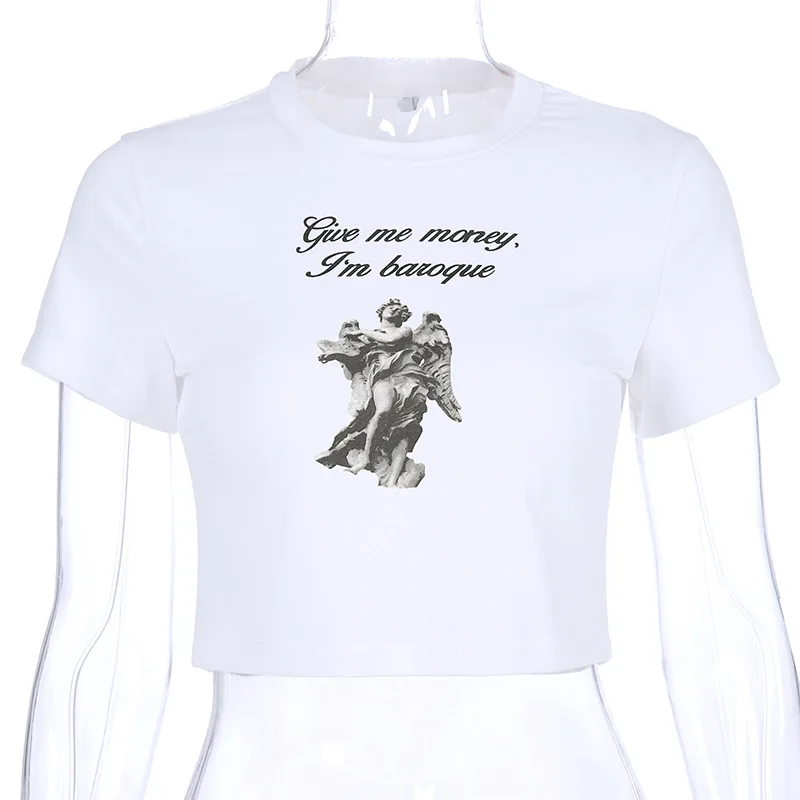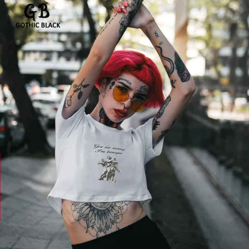 | Gothic Black Leisure Women O-Neck Short Sleeve Letter Sculpture Printing Short T-shirt Female Streetwear White Loose Crop Tops |